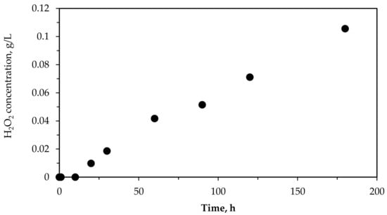 Regarding the residual H2O2 concentrations after the use of each oxidation system, it can be observed that no residual H2O2 was found after air oxidation, which is normal since no oxygen peroxide was added to the wastewater. After wastewater photolysis with artificial UV light, a concentration of 1.06 g/L of H2O2 was detected (Table 2). This was due to the production of hydrogen peroxide via UV-photolysis in the presence of some catalyst such as that contained in the OMW used (Table 1). In this sense, the UV light lamp used had a nominal level of emission intensity in the range of 200–280 nm and a power equal to 150 W. To confirm the hydrogen peroxide production, a control experiment was performed using tap water, HFeO2 as catalyst, and under UV lamp exposure. The results showed the generation of 0.106 g/L of H2O2 after 160 min (Figure 4). Similar results were reported by other authors as Campos-Martin et al. [36] and Hayes et al. [37].