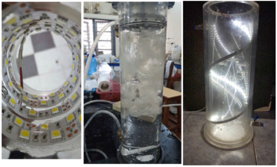 - Yu, H.; Song, L.; Hao, Y.; Lu, N.; Quan, X.; Chen, S.; Zhang, Y.; Feng, Y. Fabrication of pilot-scale photocatalytic disinfection device by installing TiO2 coated helical support into UV annular reactor for strengthening sterilization. Chem. Eng. J. 2016, 283, 1506–1513. [Google Scholar] [CrossRef]