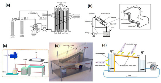 (a) Schematic diagram of a tubular continuous reactor with immobilized photocatalyst; (b) Thin film cascade photoreactor; (c) Magnetic bed reactor; (d–e) Examples of thin film fixed-bed reactors; reprinted with permission from [51] (a), [58] (b), [59] (c), [54] (d), [56] (e).