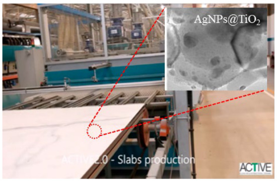 Photocatalytic self-cleaning industrial ceramics based on Ag nanoparticle-decorated TiO2 (inset) (by IrisCeramica Group—Italy) for the purification of contaminated air and bacteria inactivation, reproduced with permission from reference [109].