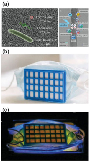 New applications are also emerging. In this respect, Horváth et al. [115] recently reported a photocatalytic mask filter based on TiO2 nanowires, which can be used as a protection against airborne viruses, including COVID-19, and can be photocatalytically sanitized under UV irradiation (Figure 5). Li et al. [116] fabricated a photocatalytic metal–organic framework (MOF)-based personal mask that can be self-disinfected under visible light.