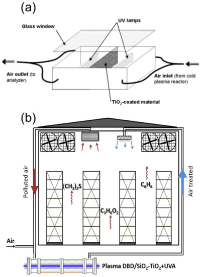 (a) Scheme of cold plasma and TiO2 combined system for the purification of ethanol-contaminated air, reproduced with permission from reference [140], Copyright 2007, American Chemical Society. (b) Combination of photocatalysis with non-thermal dielectric barrier discharge (DBD) plasma for the oxidation of propionic acid and benzene in refrigerated food chambers, reproduced with permission from reference [110], Copyright 2020, Elsevier.