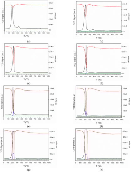 TCD signal (black) and MS signals of (red) H2, (blue) CO, and (green) CO2 during temperature-programmed reduction in 10%H2/Ar for (a) 2%Pt/ZrO2, (b) 2.89%Cs-2%Pt/ZrO2, (c) 3.87%Cs-2%Pt/ZrO2, (d) 4.80%Cs-2%Pt/ZrO2, (e) 5.78%Cs-2%Pt/ZrO2, (f) 7.22%Cs-2%Pt/ZrO2, (g) 10.41%Cs-2%Pt/ZrO2 and (h) 14.45%Cs-2%Pt/ZrO2.