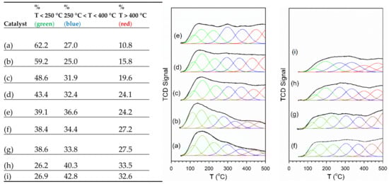 Temperature-programmed reduction (TPR) was conducted on the catalysts utilizing an Altamira AMI-300R (Pittsburgh, PA, USA) instrument coupled to a mass spectrometer from Hiden Analytical (Warrington, UK). The procedure entailed flowing 10% H2/He at 30 cm3/min (Airgas, San Antonio, TX, USA) while ramping temperature from 50 to 1000 °C at a heating rate of 10 °C/min. Samples were first pretreated in flowing He (30 ccm) at 300 °C (1 °C/min ramp rate) prior to TPR to remove H2O.