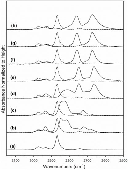 Absorbance of the formate ν(CH) band region normalized to height of band on 2%Pt/ZrO2, including: (a) 2%Pt/ZrO2, (b) 2.89%Cs-2%PtZrO2, (c) 3.87%Cs-2%Pt/ZrO2, (d) 4.80%Cs-2%Pt/ZrO2, (e) 5.78%Cs-2%Pt/ZrO2, (f) 7.22%Cs-2%Pt/ZrO2, (g) 10.41%Cs-2%Pt/ZrO2 and (h) 14.45%Cs-2%Pt/ZrO2.