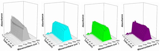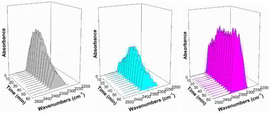 Response of the CO2 gas phase band in steam at 130 °C, including (gray) 2%Pt/ZrO2, (cyan) 2.89%Cs-2%Pt/ZrO2, and (pink) 5.78%Cs-2%Pt/ZrO2.