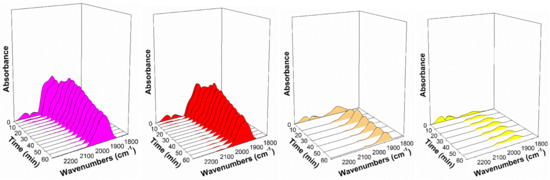 Response of the Pt-CO band in steam at 130 °C, including (gray) 2%Pt/ZrO2, (cyan) 2.89%Cs-2%PtZrO2, (green) 3.87%Cs-2%Pt/ZrO2, (purple) 4.80%Cs-2%Pt/ZrO2 (pink) 5.78%Cs-2%Pt/ZrO2, (red) 7.22%Cs-2%Pt/ZrO2, (orange) 10.41%Cs-2%Pt/ZrO2, and (yellow) 14.45%Cs-2%Pt/ZrO2.