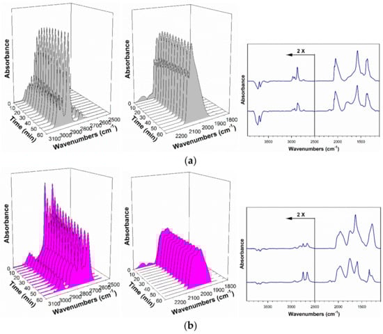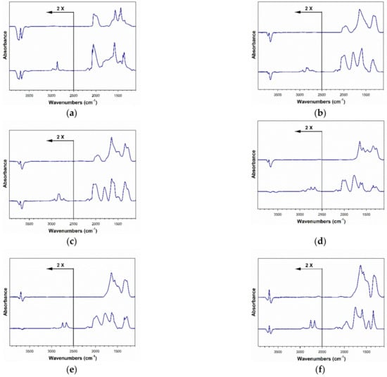 The evolution of gas-phase CO2 at ~2350 cm−1, formed from the forward decompos tion of formate, is provided for several Cs-promoted catalysts in Figure 13. For undoped, Na-doped, and K-doped Pt/ZrO2 catalysts to date, CO2 formation generally becomes at tenuated when formate has completely decomposed, and that is true even when Pt-CO bands remain present at high intensity [21,33,34], as shown in Figure 14. This finding tends to favor an associative formate mechanism in contrast to the redox mechanism, where Pt-CO serves as an intermediate. In the current series of catalysts, CO2 evolution follows this trend for the unpromoted catalyst, but it does not do so with Cs-doped catalysts, especially at higher loading. Instead, the CO2 continues to slowly evolve. This result suggests that while formate does indeed become accelerated, and, in fact, Cs is remarkably good at accelerating formate decomposition, the problem is that the second intermediate in the mechanism—carbonate species—becomes hindered from decomposing. This finding is in good agreement with the CO2 TPD trends observed previously in Figure 5. The consequence of this is a shift in the rate-limiting step from formate decomposition to car bonate decomposition. Figure 15 shows DRIFTS spectra before and after formate decom position in steam. Save for the 14.45%Cs doped catalyst, formate decomposes completely during the 60 min experiment, as evidenced by the complete loss in intensity of the for mate ν(CH) band. Following formate decomposition, residual carbonate, which is the pre cursor to CO2 formation, remains as ν(OCO) bands are evident while the ν(CH) band of formate is no longer visible. Table 3 provides band assignments of formates/carbonates.