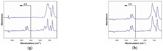 DRIFTS spectra taken (bottom) before and (top) after formate decomposition in steam, including (a) 2%Pt/ZrO2, (b) 2.89%Cs-2%PtZrO2, (c) 3.87%Cs-2%Pt/ZrO2, (d) 4.80%Cs-2%Pt/ZrO2, (e) 5.78%Cs-2%Pt/ZrO2, (f) 7.22%Cs-2%Pt/ZrO2, (g) 10.41%Cs-2%Pt/ZrO2 and (h) 14.45%Cs-2%Pt/ZrO2.