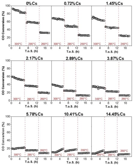 CO conversion vs. time on stream (T.o.S.) is presented in Figure 18 for catalysts with different amounts of cesium promotion, whereas the CO conversion and CO2 selectivity at steady-state conditions for each catalyst tested are summarized in Table 5. All promoted catalysts show lower conversion than the reference catalyst. The CO conversion progressively decreases by increasing the Cs loading. For example, at steady-state conditions (300 °C), the unpromoted catalyst had a conversion of 83.1%, whereas it was 63.9% and 51.1% for 0.72% and 2.17%Cs-promoted catalysts, respectively. The CO conversion drops to a value lower than 20% when the Cs loading is higher than 5.87%. After Cs promotion, the activity performance of the catalyst is no longer consistent with the rate-limiting step being the C-H bond breaking of formate. In fact, DRIFTS results showed an improvement in the forward formate decomposition rate with Cs loading until a maximum rate in the range of 4.80%–5.78%Cs. This indicates that the rate-limiting step shifts from formate decomposition (i.e., in the case of unpromoted and earlier Na [36,37] and K-promoted [38] catalysts) to CO2 desorption. This explains the decrease in activity with increasing Cs loading despite the fact that the rate of formate decomposition reaches a maximum for the catalyst promoted with 5.78%Cs. As was seen in CO2 TPD results, loading Cs increases catalyst basicity and stabilizes intermediate carbonate, preventing CO2 desorption. Cs, especially at higher loadings, also binds with Pt sites, blocking H-transfer reactions.