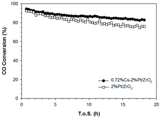 Stability test on 0.72%Cs-promoted and unpromoted Pt/ZrO2 at similar CO conversion (T = 300 °C, P = 1 atm, 26.1%H2O, 2.9%CO, 29.9%H2, 4.3%N2, 36.8% He).