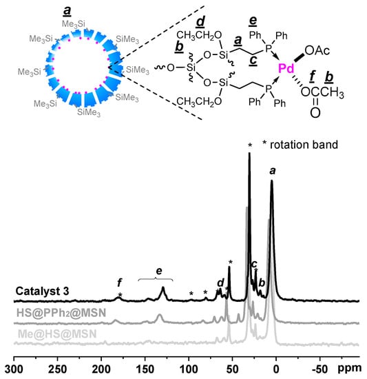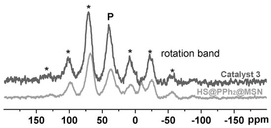 The solid-state 13C cross-polarization (CP)/magic angle spinning (MAS) NMR spectroscopy was collected to confirm the incorporation of the (PPh2)2Pd(OAc)2-functionality within the inner sphere of the hollow shell of three. As shown in Figure 1, the strong carbon signals around 5.6 ppm belonged to the –SiCH2CH2Si– groups for the ethylene-bridged moiety in catalyst 3, suggesting its ethylene-bridged network of the organosilicate shell. Especially, the characteristic peaks at 26.9 and 188.5–174.3 ppm for the carbon atoms of –CH2P and –PC6H5 groups were presented in catalyst 3, similar to those of its homogeneous counterpart [50]. Further, in the spectrum of three, the strong signals for the carbon atoms of the aromatic ring could be observed clearly, while all these peaks were absent in the spectrum of one, revealing that three had the same well-defined single-site active species as its homogeneous counterpart. Moreover, its solid-state 31P CP MAS spectrum (Figure 2) also demonstrated the same well-defined single-site active species as its homogeneous counterpart [51].