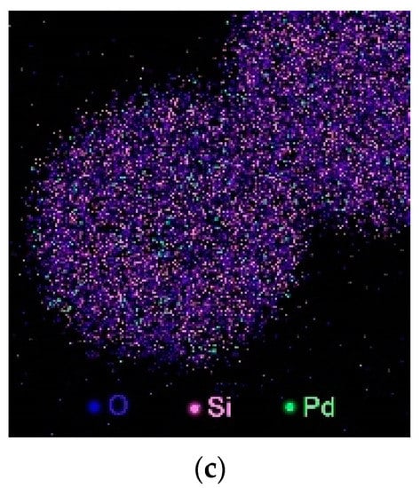 (a) The scanning electron microscopy (SEM) images of catalyst 3, (b) the transmission electron microscopy (TEM) images of catalyst 3, (c) a TEM image with the chemical mapping of 3 showing the distribution of Si (pink), O (blue), and Pd (green).
