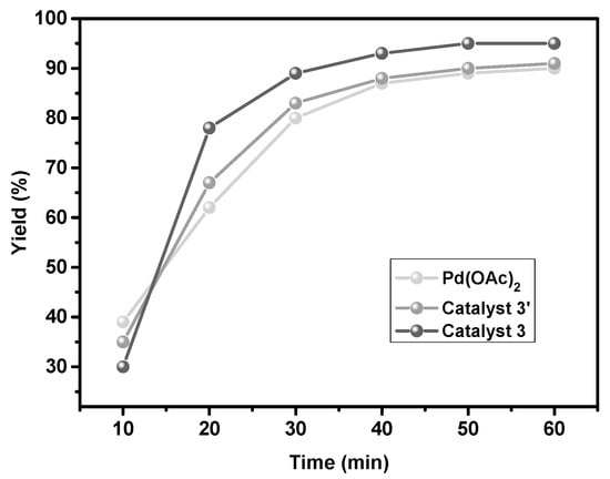 To elucidate the benefit of the surface protection of –Si(Me)3 for the designed silica-supported heterogeneous catalyst 3, the kinetic reaction profiling for the Suzuki-Miyaura cross-coupling reaction catalyzed by Pd(OAc)2, three, and 3′ (the three capped with-Si(CH3)3 groups was obtained by silanization of 3′ and hexamethyldisilazane) were compared to demonstrate their differences in the catalytic performance (Figure 6). It was found that three had a higher reaction speed and yield than that attained with the others, elucidating that surface silanols in catalyst 3 could promote synergistically cross-coupling by concentrating reactants inside the hollow shell. This observation was strongly similar to that reported in the literature [52,53], disclosing the superiority of the designed catalyst 3.
