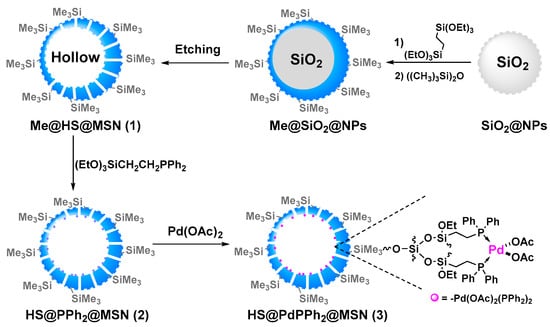 Hollow-shell structures are distinctive woid shell configuration materials [34,35,36,37]. In recent years, they have attracted tremendous interest in nanoreactors [38], biomedicine [39], lithium-ion batteries [40,41,42], and photocatalysis [43]. Benefiting from the hierarchical porous structures of the shell, the confined functionality of the inner shell showed good substance-loading properties, as well as faster mass diffusion [16]. Thus, the affinity of the substrates and the catalytic-active site improved within hollow shells, making them good candidates as highly active catalytic materials. Significantly, the immobilization of the catalytic active site onto the specific skeleton mesoporous silica materials was extensively employed for improving its activity and recyclability [44,45,46]. For example, the silica gel-supported N-heterocyclic carbene-Pd (NHC-Pd) [25] and the core-shell hybrid Fe3O4@SiO2@Pd catalyst [24,47] compared to those reported mesoporous silica-supported Pd catalysts, the functionality of the hollow in the shell-structure has rarely been studied in regard to Suzuki-Miyamura cross-coupling reactions. By protecting the outer wall of the hollow shells by specific hydrophobic groups, the catalytically active sites could be accurately located on the inner wall, while the hollow provided a relatively homogeneous space that was isolated by a permeable shell, thereby providing a promising platform for heterogeneous catalysis application [48,49].