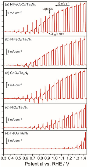 i-E curves obtained from Ta3N5/Ta photoanodes modified with electrocatalysts: (a) NiFeCoOx, (b) NiFeOx, (c) CoOx, (d) NiOx, and (e) FeOx in 0.1 M sodium phosphate aqueous solution with pH adjusted to 13 by NaOH addition under simulated sunlight (1 sun, AM 1.5G). The potential sweep rate (v) and intermittent irradiation period were 10 mV s−1 and 6 s, respectively.