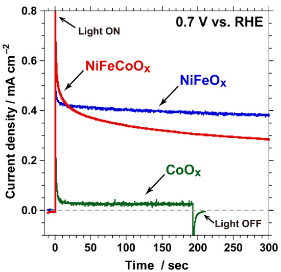 i-t curves recorded at 0.7 V vs. the RHE for NiFeCoOx/Ta3N5/Ta (red), NiFeOx/Ta3N5/Ta (blue), and CoOx/Ta3N5/Ta (green) photoanodes in 0.1 M sodium phosphate aqueous solution with pH adjusted to 13 by NaOH addition under simulated sunlight (1 sun, AM 1.5G).