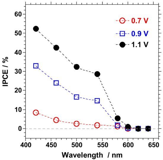 Figure 3 shows the wavelength dependence of the incident photon-to-current conversion efficiency (IPCE) for NiFeOx/Ta3N5/Ta photoanodes recorded at 0.7, 0.9, and 1.1 V vs. the RHE. The IPCE spectra demonstrate that NiFeOx/Ta3N5/Ta photoanodes can generate a photocurrent under light illumination up to a wavelength of 600 nm, which corresponds to the absorption edge wavelength for Ta3N5. Generally, the IPCE increased as the wavelength decreased and the electrode potential became more positive, because of the shorter light penetration depth and the wider depletion layer at the solid/liquid interface. For illumination with 420 nm monochromatic light, the IPCEs at 0.7, 0.9, and 1.1 V vs. the RHE were found to be 8%, 32%, and 52%, respectively. Intriguingly, the IPCE values at 0.7 V and 1.1 V were comparable at the wavelength of 580 nm, indicating that most of the photocurrent originated from energy conversion utilizing visible light in the short wavelength region.