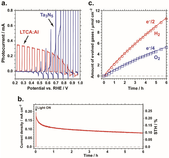 Hydrogen and oxygen were generated by the parallel PEC cell at a stoichiometric ratio of 2:1 over 6 h, as shown in Figure 4c. The amounts of evolved hydrogen and oxygen were consistent with the values calculated from the total charge calculated from the recorded photocurrent, indicating that the Faradaic efficiency for overall water splitting for the cell is ~97%. We note that the apparent delay in gas detection for the initial 1 h is due to the time required for homogenization of the gas phase in the measurement system. The average gas generation rates over the 6 h period were approximately 1.8 µmol cm−2 h−1 for hydrogen and 0.9 µmol cm−2 h−1 for oxygen. The hydrogen and oxygen generation rates were approximately 1.6 times higher than those previously reported for a parallel PEC cell composed of an Ir–Co catalyst-loaded BaTaO2N photoanode and a Pt/TiO2/CdS/LTCA:Al photocathode with average gas generation rates of 1.1 µmol cm−2 h−1 for hydrogen and 0.55 µmol cm−2 h−1 for oxygen [9]. The slightly higher STH for the parallel PEC cell incorporating the Ta3N5–LTCA:Al combination originates from the improved photocurrent for the PEC cells at Ework.