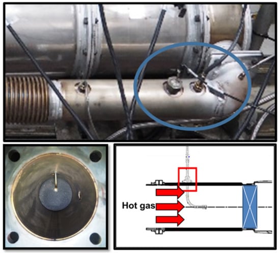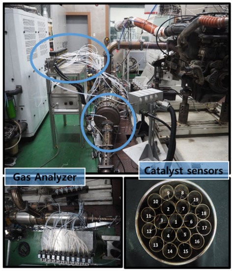 These experimental studies used a six-cylinder four-stroke heavy-duty diesel engine and water-cooled with natural aspiration. The 1000 rpm engine speed produces a 513 kg/h exhaust mass flow rate and a 1330 ppm NOx value with NO2/NOx feed ratio (0–1) and keeps the NH3/NOx feed ratio alpha = 1 [6]. The Hyundai D6CC diesel engine produces a high NOx emission at 1000 rpm and is easy to observe in the system. The exhaust gas concentration was computed using the gas analyzer before the experimental study. The uncertainty of coefficients exhaust gas from the gas analyzer (MEXA-7100 DEGR; Horiba ATS, Kyoto, Japan) was 5% or 1.0 µm uncertainty [15]. The experimental setup and schematic diagram of the current study are shown in Figure 12.