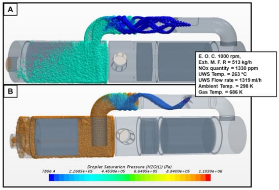 The urea saturation value: (A) original urea injector; (B) suggested urea injector for Hyundai D6CC.