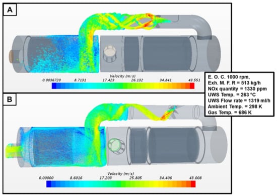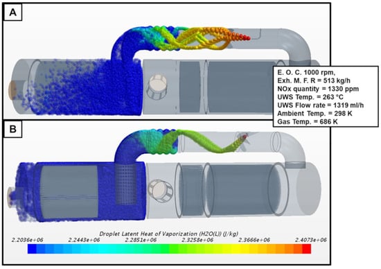 The urea vaporization values: (A) original urea injector; (B) suggested urea injector for Hyundai D6CC.