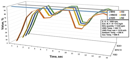 The urea distribution in the system can be affected by the exhaust gas. The Hyundai D6CC heavy-duty diesel engine produced a large exhaust mass flow rate (513 kg/h) and NOx flow rate (1083 g/h). Those gas flow rates were assisted the UWS distribution to the entire system. In this section, we discuss and demonstrate the UWS distribution and explain the efficiency of the ammonia generation process, as seen in Figure 3 and Figure 4.