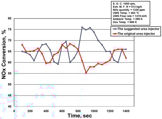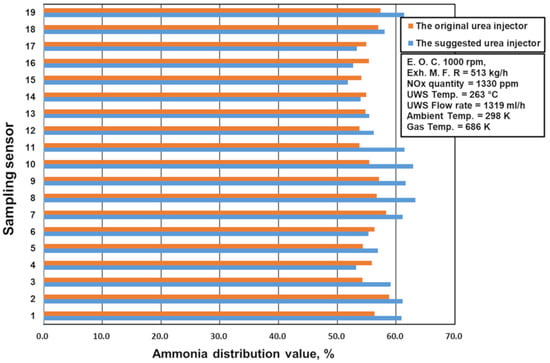 Figure 7 shows the 19 sensors on the catalyst surface and Figure 8 shows the ammonia concentration value from the gas analyzer. The results show that the suggested urea injector for the Hyundai D6CC (blue bars) produced more ammonia than the original urea injector from Hyundai D6CC (red bars); more ammonia in an SCR system is also indicative of higher NOx conversion. Figure 9 compares the amounts of NOx conversion from the experiment. The suggested urea injector converted more NOx than the original urea injector. This result shows that the suggested urea injector has a suitable shape and position for urea injection in a commercial SCR system by Hyundai D6CC, enhancing the urea particle conversion into ammonia and minimizing the possibility of solid deposits inside the injector. Therefore, this urea injector is recommended to improve NOx conversion in Hyundai D6CC and can be used for other commercial SCR systems that use different types of heavy-duty diesel engines.