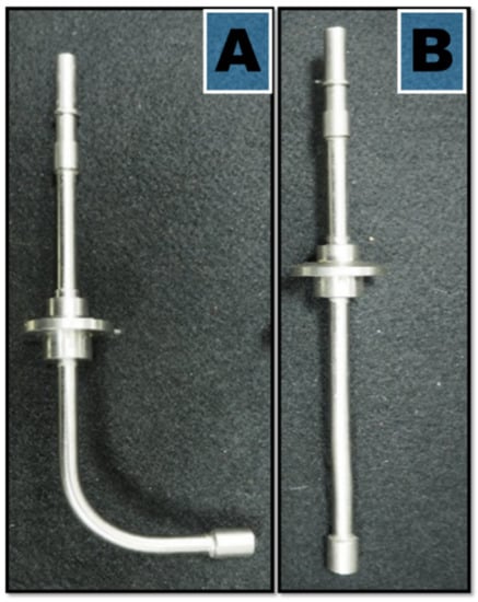 The two urea injector models: (A) the original injector from the D6CC diesel engine; (B) the suggested urea injector [2].