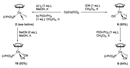 For further comparison, we also synthesized complexes containing cyano groups to elucidate the influence of this pseudo halide on complex reactivity. It is known that cyanogen iodide, ICN, reacts smoothly with CpCo(CO)2, although the resulting compound has never been investigated further for catalytic purposes [20]. Again, substitution of the second CO ligand for a phosphite occurred smoothly for complex 8 as was demonstrated with P(Oi-Pr)3. In addition, we realized the exchange of both iodide atoms in compound 2 in the presence of alkali metal cyanide, yielding complex 10 [21,22]. The synthesis results are displayed in Scheme 2. According to the cited reference for the synthesis [21], replacement of the iodides for cyanide groups in the presence of the CO ligand like in complex 1 is not possible, because it would lead to the formation of undesired reaction products. Therefore, the presented sequence of substitution (first CO exchange for the phosphite ligand, then substitution of the iodide for the cyanide) is mandatory.