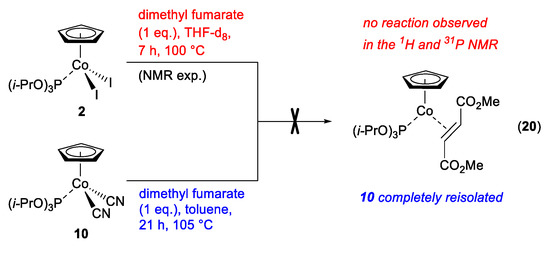 We assumed that the catalytic activity might arise from preceding reduction of the CpCo(III) complex to a CpCo(I) complex. There is evidence for this assumption for CpCo(III)(PPh3)-dialkyl complexes like CpCo(Me)2(PPh3), who gave cobaltacyclopentadienes upon reaction with alkynes under thermal conditions, implying reductive elimination of the alkyl groups [25]. However, the PPh3 ligand is detrimental for the catalytic activity of the complexes and less comparable to phosphites as ligand in this setting. Experiments with 2 under addition of elemental zinc did basically show no difference compared to catalysis with 2 without additive (compare entries Table 1 and Table 2). The simplest process would thus be reductive elimination of the anionic groups. While this can be imagined with complex 9-Me (reductive elimination of MeCN), the elimination from diiodide complex 2 or dicyanide complex 10 are significantly less likely. We investigated this possibility for the latter by scavenging experiments, as the complexes are heated in the presence of dimethyl fumarate, leading in the case of successful reductive elimination processes to CpCo[P(Oi-Pr)3](dimethyl fumarate) (20) and the corresponding elimination products. However, the experiments showed neither in the NMR experiment nor on preparative scale that reductive elimination occurred from the CpCo(III) complexes (Scheme 7).