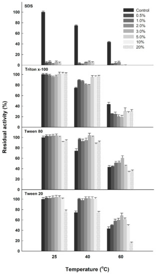 Effects of four different surfactants on the esterase activity of His6-tagged BdPTE. The enzyme samples were pre-incubated at the indicated temperatures for 1 h before activity assays. The esterase activity in the absence of surfactants was used as a control (100%).