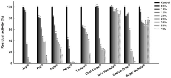 Effects of some brands of liquid detergents on the esterase activity of His6-tagged BdPTE. The enzyme samples were pre-incubated at ambient temperature for 1 h before activity assays. The esterase activity in the absence of detergents was used as a control (100%).