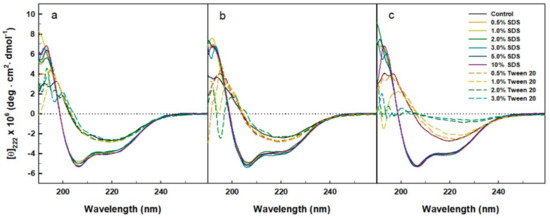 Previously, the impact of surfactants on protein stability and folding kinetics has been thoroughly reviewed by Otzen and co-workers [6,14,15]. Since surfactants and proteins are all amphiphilic molecules, some intermolecular interactions, particularly hydrophobic and electrostatic, can occur [16,17]. Protein–surfactant interactions at the hydrophobic interfaces have been shown to play a critical role in protein folding by enhancing the compactness of protein’s unique three-dimensional shape [18]. The importance of electrostatic interactions can also be seen by studying the effect of pH on protein–surfactant interactions [19]. With regard to SDS, these interactions are much stronger than those of other denaturants (e.g., urea and GdnHCl), which have been proved to act through weak interactions with the backbone of proteins [20]. Surfactant-mediated denaturation of a specific protein is initiated from the surface-accessible regions and eventually leads to the changes in its secondary and tertiary structures [21]. In general, a protein subjected to surfactant-mediated denaturation can recover its native state upon removal of the denaturant, although the refolding yield varies substantially from protein to protein [22,23,24]. A research study on β-lactoglobulin, lysozyme, and bovine serum albumin has shown that the surfactant-mediated unfolding and refolding of these globular proteins are extremely complex processes with conformational rearrangements occurring on time scales from sub-milliseconds to minutes [24].