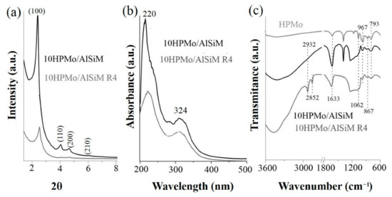 To verify the integrity of the catalyst after successive esterification reactions, it was analyzed by the XRD, DRS and FTIR techniques after a fourth reuse cycle (Figure 2a–c). Figure 2a shows the XRD of the 10HPMo/AlSiM and 10HPMo/AlSiM R4 catalysts. There was a clear reduction in peak intensity corresponding to reflection (100), followed by the absence of reflection (110, 200 and 210), a strong indication that the hexagonal mesostructure had become disordered, [4,15,62], but was still preserved [4,62]. This was expected, since the reactions were conducted under aggressive mechanical agitation and temperature conditions [15,30,37,62].