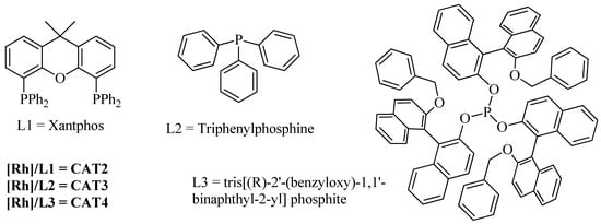 Catalysts CAT2, CAT3, and CAT4 were prepared in situ, using the known P-ligands and corresponding rhodium salts. (Figure 1, L1 = Xantphos, L2 = triphenylphosphine, or L3 = tris[(R)-2′-(benzyloxy)-1,1′-binaphthyl-2-yl] phosphite [49]) with the commercially available pre-catalyst [Rh(acac)(CO)2] (see experimental section).