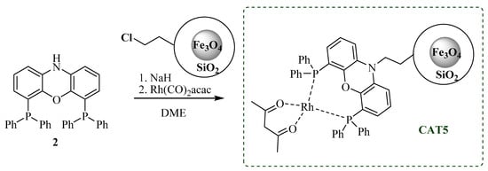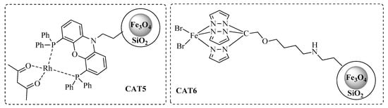 Heterogeneous catalysts (CAT5 and CAT6, Figure 2) were prepared through the synthesis and 3-aminopropyl functionalization of core–shell magnetic iron nanoparticles, followed by covalent grafting of the suitable functionalized homogeneous ligand.
