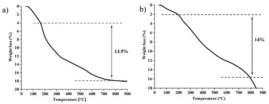 The MNP were prepared by co-precipitation method using Fe2+/Fe3+ ions under alkaline reaction conditions, followed by stabilization with oleic acid addition at 10,000 rpm [50]. Transmission electronic microscopy (TEM) analysis of MNP shows the formation of magnetite nanoparticles (≈7 nm) (Figure S5). Then, MNP@SiO2 were prepared according to a previously described method [51], by reacting MNP with tetraethyl orthosilicate (TEOS) under alkaline conditions. MNP@SiO2 were obtained with approximately 23 nm size, as shown in the TEM analysis, (Figure S6). All particle size measurements were performed in triplicate. Additionally, the obtained material was analyzed by thermogravimetry (TG). The MNP@SiO2 thermogram (Figure 3a) shows a weight loss in the temperature range of 50–150 °C, attributed to the loss of adsorbed water and solvents. Another 1.5% weight loss occurred between 200 and 800 °C, which can be attributed to the decomposition of silanol groups of MNP@SiO2.