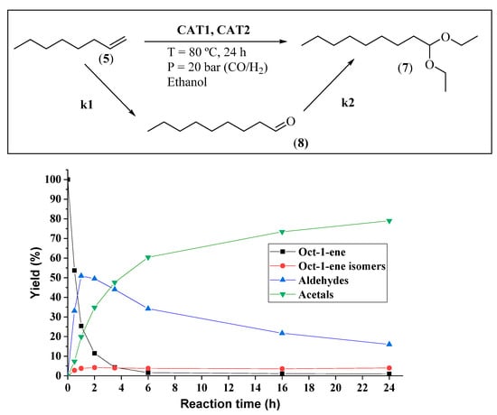 From the analysis of Figure 5, nearly 75% olefin conversion was achieved after just 1 h (51% selectivity for aldehydes and 20% for acetals). As expected, after this period, the yield of aldehydes started to decrease with concomitant increase in acetal formation throughout the experiment. The kinetic profile of the bimetallic catalytic system shows that both the hydroformylation (k1) and acetalization (k2) rates decrease over time, suggesting that the hydroformylation rate is dependent on olefin concentration and the acetal formation is dependent on aldehyde concentration. After 24 h, 99% of oct-1-ene conversion was observed, with 79% acetals, and 16% of non-converted aldehydes, besides 4% of oct-1-ene isomers which was constant during the experiment (Figure 5). Scheme 5 illustrates the simplified mechanism pathways for the direct synthesis of acetals from terminal alkyl olefins [62,63]. As known, the Rh(I)/Xantphos catalyst (CAT2) catalyzes the regioselective formation of linear aldehyde. Then, the presence of CAT1 (Fe(II)/C-scorpionate), an appropriate Lewis acid, and ethanol promotes the sequential transformation of the aldehyde into ethyl acetal.