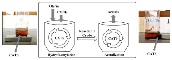 The immobilized MNP@SiO2-NH-Rh(I)/N-Xantphos CAT5 revealed to be very active and selective, reaching 99% conversion, aldehyde chemoselectivity of 96% and 98% regioselectivity for the linear aldehyde (Table 3, Entry 1). Next, we evaluated MNP@SiO2-NH-[FeBr2{allyl-HC(pz)3], CAT6, in the acetalization of commercial nonanal, using ethanol, under hydroformylation conditions, and 1,1-diethoxynonane was obtained in 90% yield (Table 3, Entry 2). Then, the combination of CAT5 and CAT6 was tested, by mixing them in an autoclave and using the general procedure described above. Under these experimental conditions, we obtained 92% of conversion, 54% of oct-1-ene isomers, and just 38% of aldehydes. Thus, the simultaneous use of CAT5 and CAT6 led to a significant loss of chemoselectivity concomitantly with no transformation into the desired acetal (Table 3, Entry 3). Contrarily, when CAT5 is used in the hydroformylation step and then removed with the aid of an external magnet from the reaction medium, (crude contains 96% of aldehydes; Table 3 Entry 1), the addition of CAT6 leads to the formation of acetals in 87% yield (Table 3, Entry 4). The lack of orthogonality observed exclusively under these heterogeneous conditions may be attributed to the presence of free residual NH2 groups on the CAT6 magnetic nanoparticles surfaces that may coordinate with the Rh salt and thus affect the process selectivity. These results indicate that both CAT5 and CAT6 are active and selective for the hydroformylation/acetalization process, when the reactions are performed in two sequential independent steps, Figure 6.