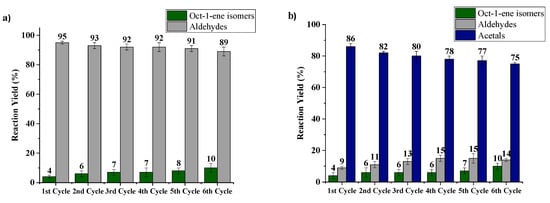 Two-step hydroformylation/acetalization of oct-1-ene, reutilization test: (a) hydroformylation step: 3 mmol oct-1-ene, CAT5 180 mg (≈0.02 mmol [Rh]), 6 mL ethanol at 80 °C, 20 bar (CO:H2) for 24 h and (b) acetalization step: using hydroformylation step reaction crude, CAT6 300 mg (≈0.04 mmol (Fe)) at 80 °C for 20 h.