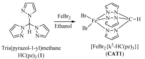 The iron(II)-C-scorpionate catalyst (CAT1) was synthesized by slight modifications of previously described methods [47,48] (Scheme 1). An ethanol solution of Ligand HC(pz)3 (1) was added dropwise to a room temperature stirred iron(II) bromide ethanol solution, under inert atmosphere providing, after 2 h, [FeBr2{κ3-HC(pz)3}] (CAT1) in 91% yield. Samples of CAT1 were characterized by 1H- and 13C-NMR spectroscopy, HRMS, and IR spectroscopy (see SI).