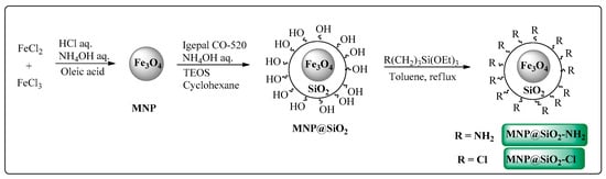 The magnetic nanoparticles were obtained through preparation of magnetite (MNP) followed by silica coating with further 3-amino- or 3-chloropropyl-functionalization (Scheme 2).