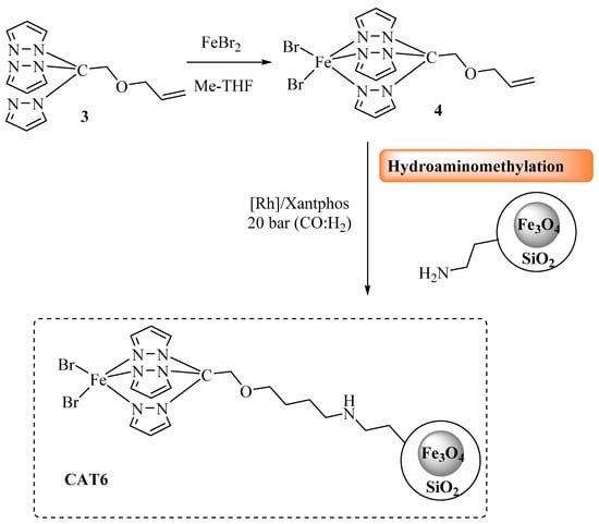 Preparation of [FeBr2{HC(pz)3}] immobilized catalyst CAT6 via hydroaminomethylation reaction.