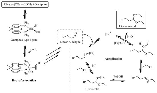 Proposed simplified mechanisms for hydroformylation/acetalization of olefins with CAT2 ([Rh(acac)(CO)2]/Xantphos) and CAT1 ([FeBr2{κ3HC(pz)3}], here represented by [Fe]).