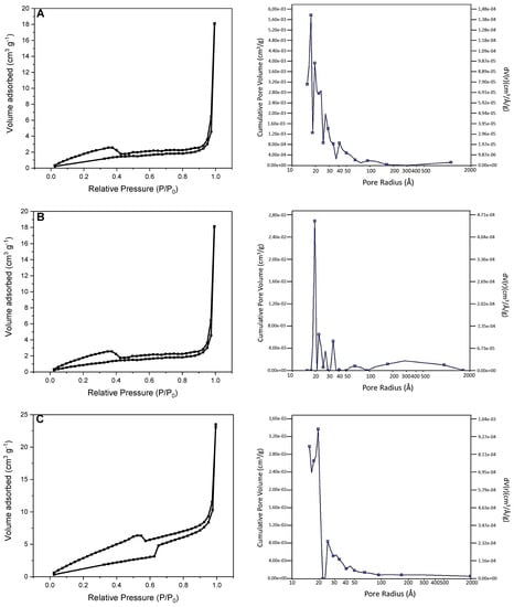 Isothermal data (left) and pore size distributions (right) of catalyst material: (A) pristine, (B) after fourth cycle, and (C) after fourth cycle and thermic treatment at 400 °C.