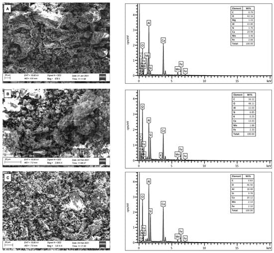 SEM-EDX analyses were performed with an electron microscope FESEM-EDX Carl Zeiss Sigma 300 VP. The samples were fixed on aluminum stubs and then sputtered with graphite using a Sputter Quorum Q150. Additionally, the chemical composition was determined by EDX under the scanning electron microscope and X-rays diffraction.