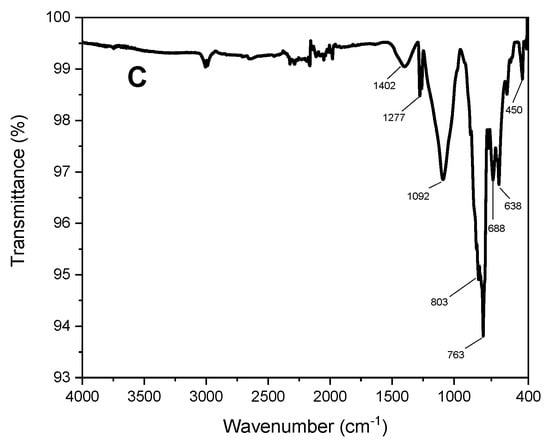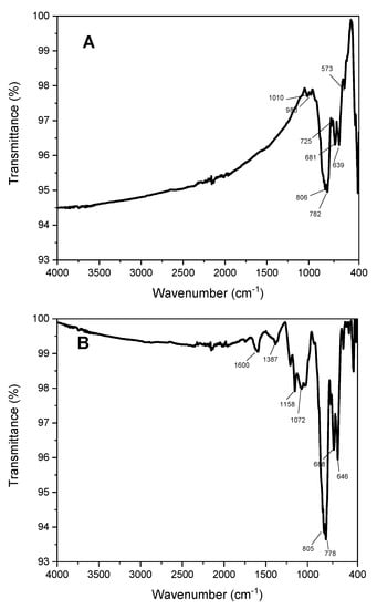 ATR-FTIR analyses showed a broad band signal in the range 3450–3000 cm−1, together with signals at 1010 and 980 cm−1 due to O–H deformation vibrations [9]. Moreover, signals at 806 and 782, cm−1 are attributable to the symmetrical stretching of Si–O–Si. Finally, bands at 639 and 681 cm−1 can be assigned to the Al–O stretching mode (Figure 3A) [13,14].