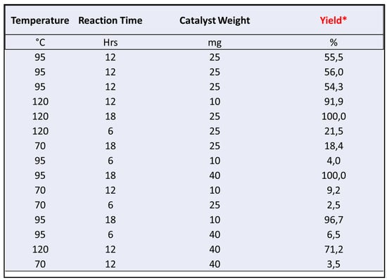 Finally, response surface graph in Figure 5c shows that maximum performances are obtained with a temperature of 109 °C and with a reaction time of 14 h. Given that the catalyst weight is a negligible parameter, an average quantity of 20 mg in the range investigated (10–40 mg) was chosen for further experiments.