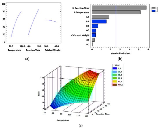 (a) Main effect plots for reaction yield, (b) standardized Pareto chart, and (c) response surface graph (catalyst weight 25 mg) of DOE method applied to steel slag catalytic performances.
